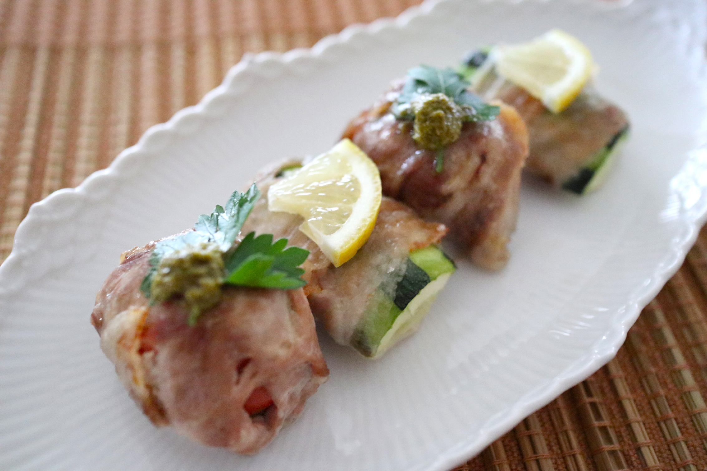 トマトは肩ロース、ズッキーニはバラ肉で巻き、